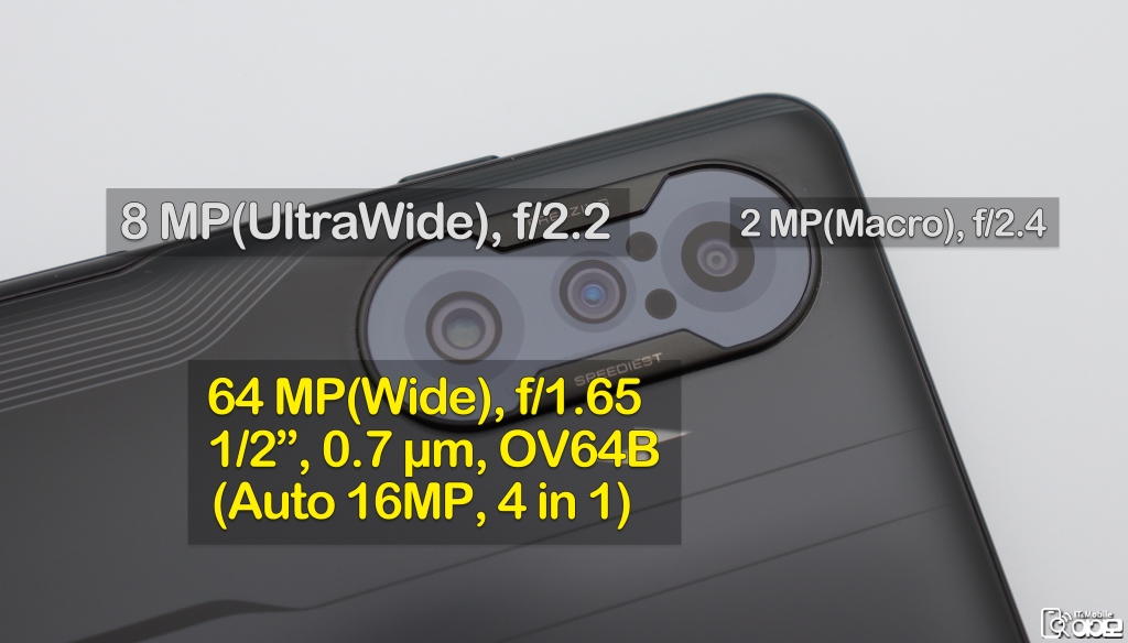 최대 64MP라는 광각 카메라는 OmniVision의 OV64B라는 센서를 사용했구요. 조리개는 밝은 편이지만 다른 폰들과 마찬가지로 4 in 1 픽셀 비닝으로 작은 센서 사이즈와 픽셀 피치를 해결하려고 한 모양입니다.