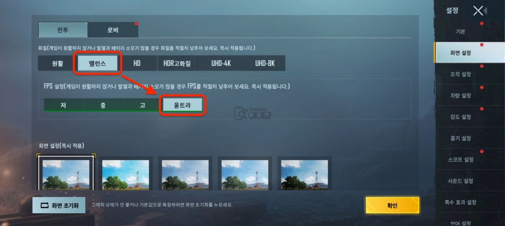 모바일 배틀 그라운드 기준 밸런스 화질에 FPS 설정은 울트라!