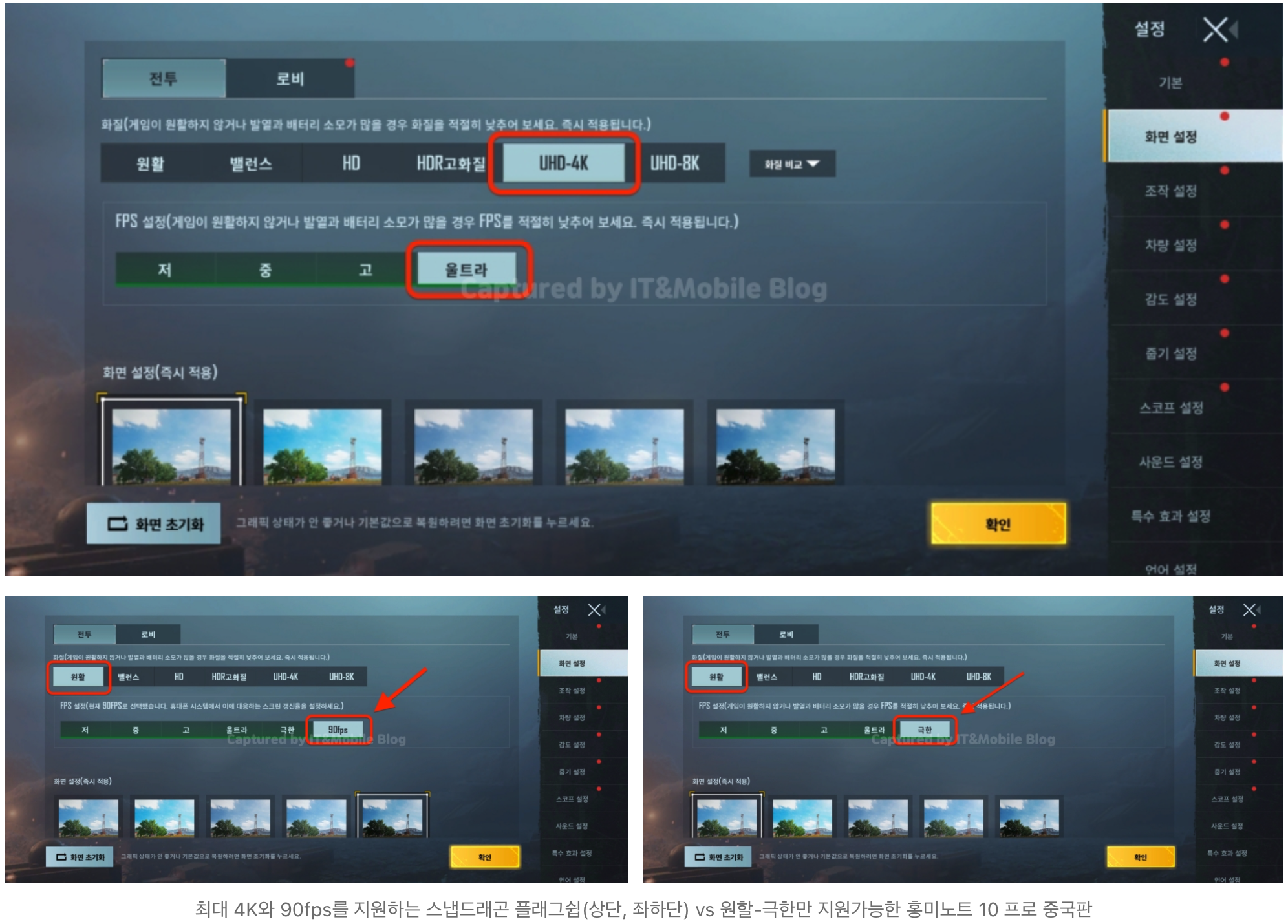 다른 게임들에 비해 옵션이 세분화 되어있는 모바일 배틀그라운드로 확인을 해보자면 미 10 프로는 물론이고 포코 X3 프로도 화질은 최대 4K, 프레임은 최대 90fps까지 사용이 가능하지만 홍미노트 10 프로 중국판은 스냅드래곤 855 기기들에서 플레이하던 화질 원활에 극한(60fps)까지가 한계였습니다.