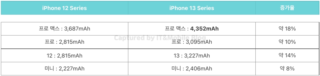 모든 아이폰 13 시리즈가 배터리 용량이 늘어났지만 아무래도 크기 덕분인지 아이폰 13 프로 맥스가 약 18% 정도 배터리가 늘어나면서 4,352mAh로 가장 많은 배터리를 확보하고 있고요. 작은 사이즈는 매력적이지만 배터리가 가장 큰 문제였던 아이폰 13 미니는 약 8% 정도 늘어란 2,406mAh 배터리를 탑재하고 있는 걸로 확인이 되었습니다.
