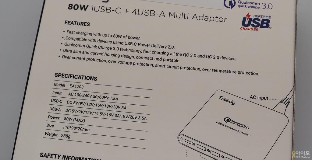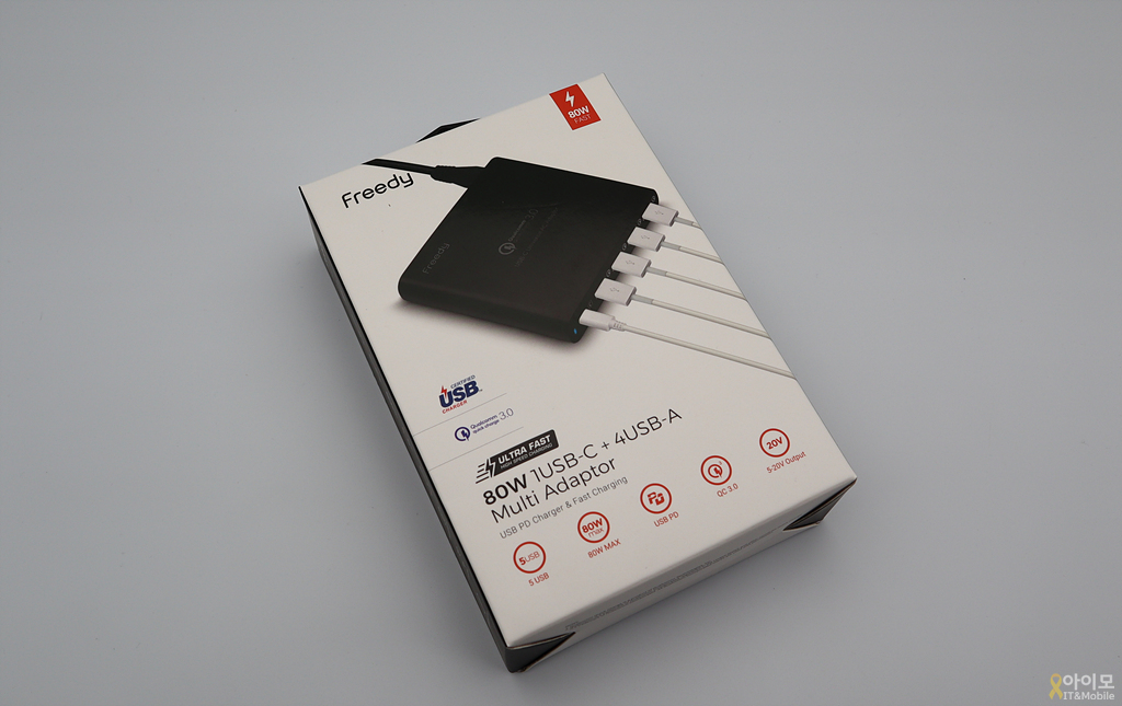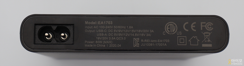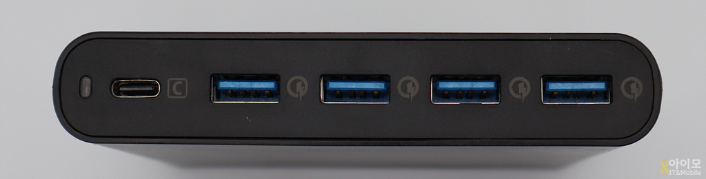 USB-C 포트는 PD 2.0 호환 최대 20V 3A, 60W의 출력을, USB-A포트는 QC 3.0 호환 최대 20V 3.5A의 70W를 지원하고 있어서 출력만 생각하자면 일반 멀티포트 충전기와 크게 다르지 않습니다.