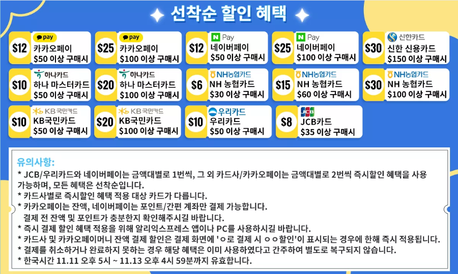 알리에서도 스토어별 할인과 알리 자체에서 제공하는 금액대별 할인 쿠폰이 제공이 되겠지만 여러 카드사와 제휴된 즉시할인까지 포함하면 상당히 쏠쏠한 할인이 되지 않을까 생각됩니다.