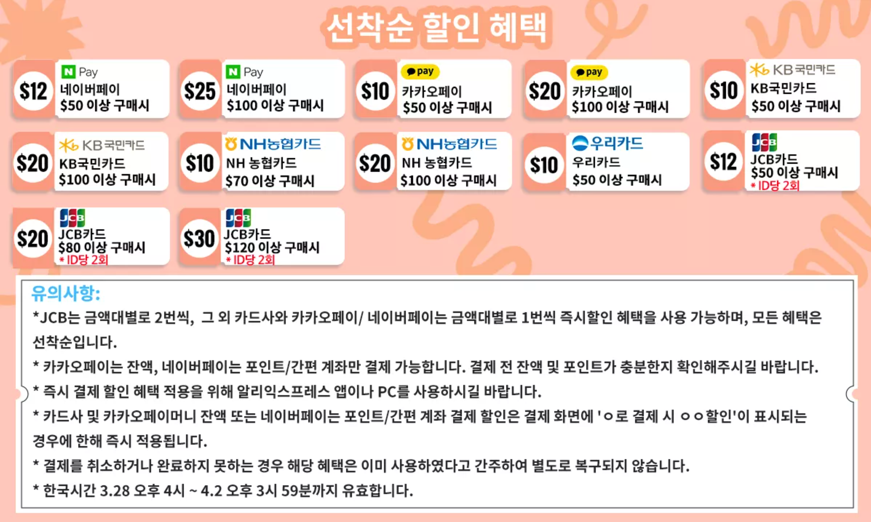 작년 광군절이나 블랙 프라이데이 할인 행사와 마찬가지로 신용카드와 간편 결제 등 결제 수단에 따른 즉시 할인이 이번 알리 익스프레스 12주년 세일에도 진행되고요.
