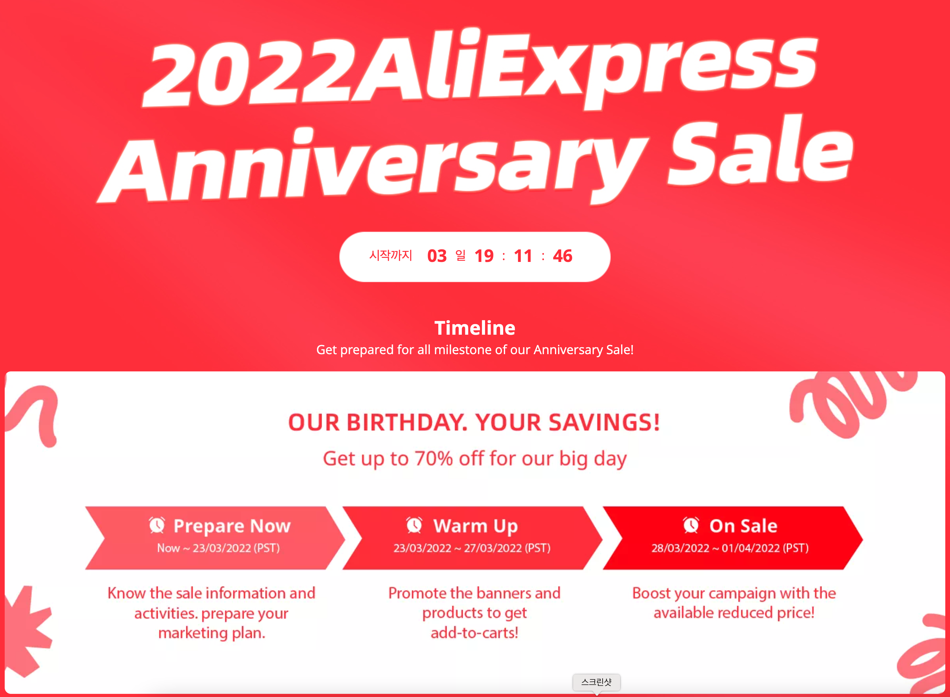 알리 익스프레스는 두세 달에 한 번 정도 중국/글로벌 시즌에 맞춰 할인 행사를 개최하지만 다음 주, 3월 28일부터 시작하는 AliExpress Annivsersary Sale은 알리 생일 축하 세일이죠!