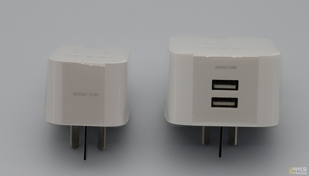이에 비해 신형 스마트 플러그는 와이파이와 블루투스 동시 지원, 이 덕분에 게이트웨이 유무에 관계없이 개별로 동작이 가능하고 사진에서 보시다시피 최대 5V 2A, 10W의 USB-A 포트 2개까지 가지고 있어서 덩치가 무척이나 커진 편입니다.