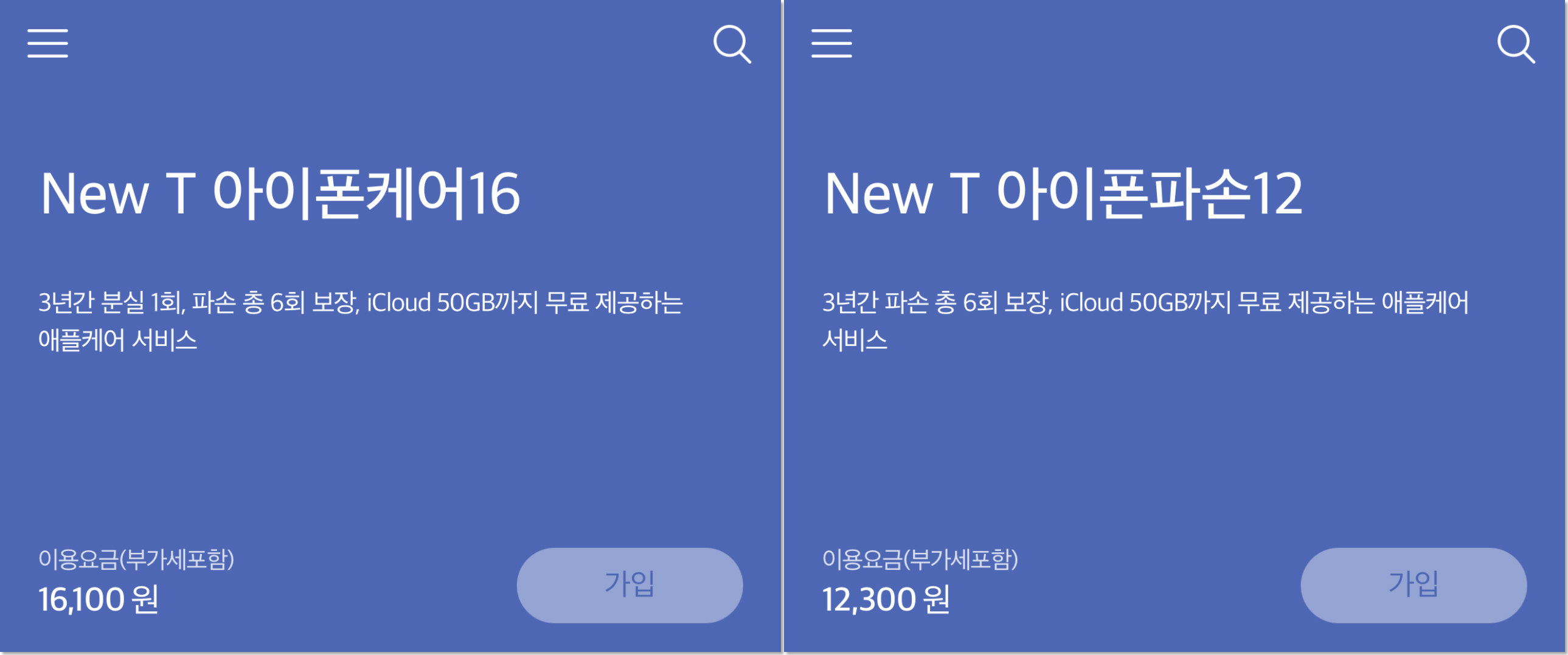 제가 아이폰 12 프로 맥스를 구입한 SKT는 New T아이폰케어/파손이라는 상품을 내놓고 있던데요.