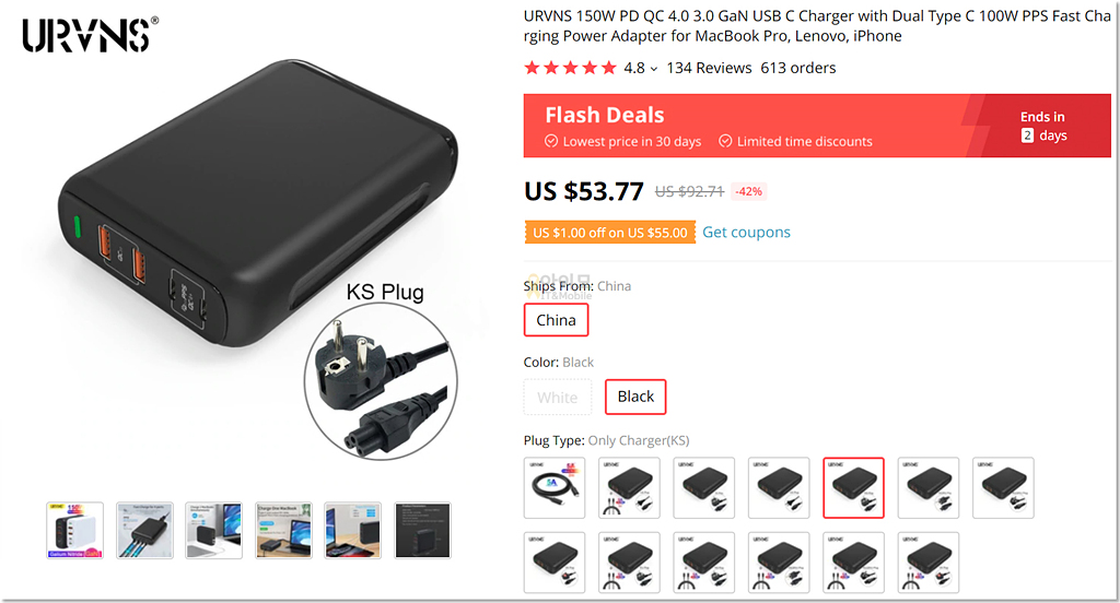 매번 주문을 할까 하다가도 가격이 너무 비싼 느낌이라 장바구니에만 담아두고 있던 URVNS 150W PD 충전기도 그 대상 중 하나였습니다.