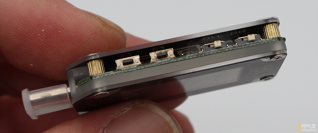 디스플레이 기준으로 하단에는 업데이트 등에 사용될 Micro 5핀 포트가 하나 보이구요. 반대편에는 조작에 사용할 버튼 4개가 배치가 되어있지만 앞쪽에 있는 버튼 2개로 대부분의 테스트를 진행합니다.