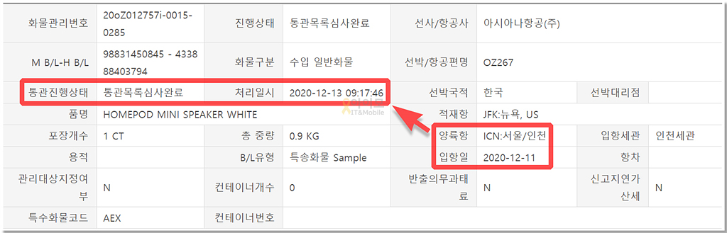 블프 물량은 물론이고 코로나 덕분에 항공편 부킹이 제대로 되지 않는 건지 그다음 날인 12월 9일에서야 겨우 출고가 완료되었습니다.