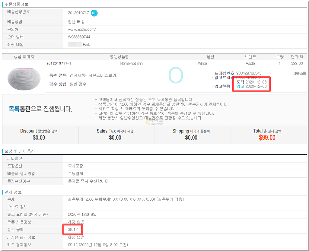 열흘 정도는 기다려야 하는 게 아닌가 예상을 했지만 미국 시간으로 12월 8일 입고와 배송비 결제 문자가 도착을 했구요.