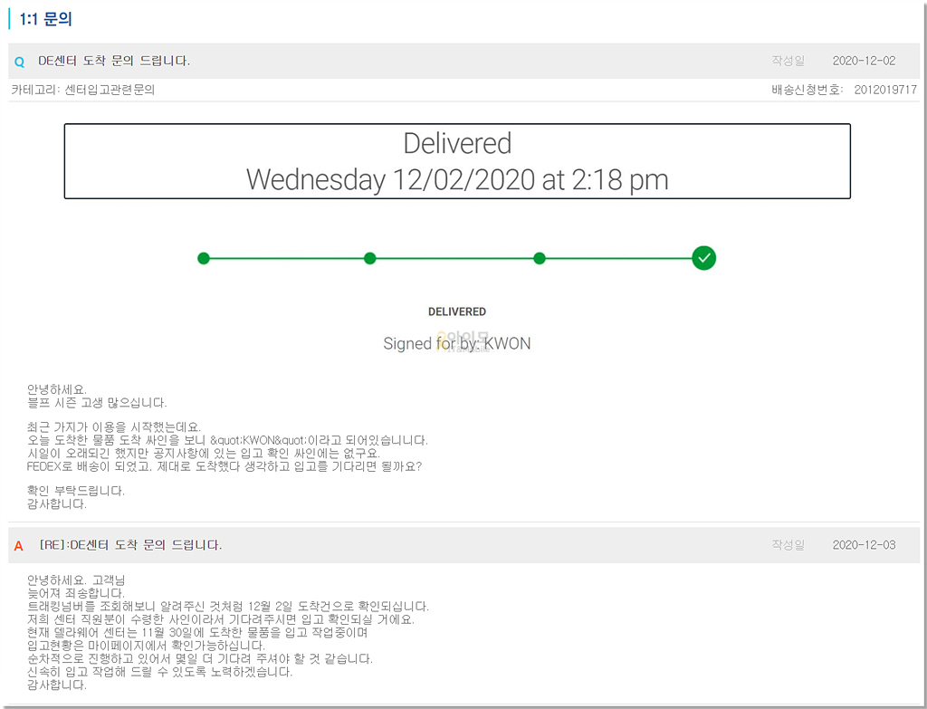 거기에 평소에 자주 이용하던 배대지도 아닌지라 "KWON"이라는 수령 사인이 가지다 사인이 맞는 건지 확인도 안 되고, 간간이 들려오는 소식으로는 델라웨어에 몰려있는 배대지들에 도난 사고가 급증한다고 하니 가지다 도착 여부를 1:1 문의를 통해 확인하는 방법뿐이었습니다.