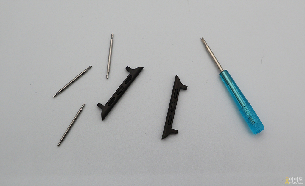 애플 워치 밴드 커넥터라고 해야 할지 클립 정도라고 해야 할지.... 커넥터 2개와 밴드 핀, 그리고 밴드 핀 탈/장착용 공구가 구성품의 전부이구요.
