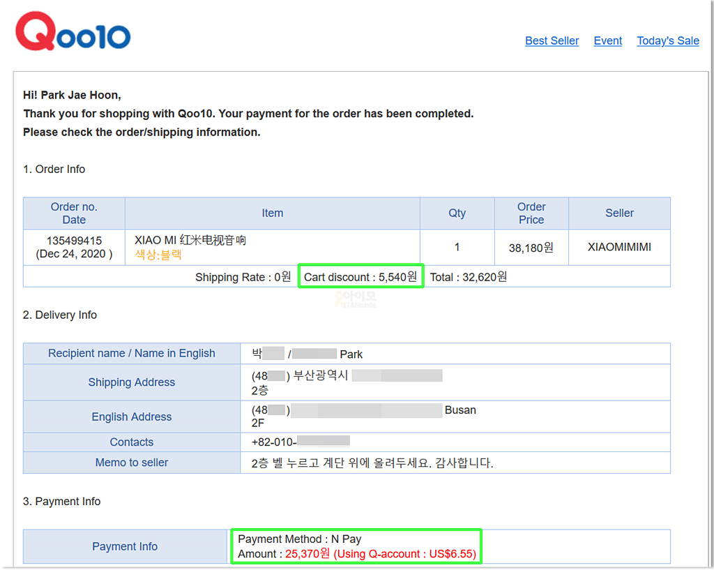 외부 스피커를 연결하면 된다지만 남아있는 스피커는 어느 집이나 흔히 굴러다니는 USB 전원 타입의 6W 스피커뿐이라 최근 검색을 통해서 알고 있던 샤오미(홍미, Redmi) 사운드라바는 물건을 큐텐을 통해 구매했습니다.