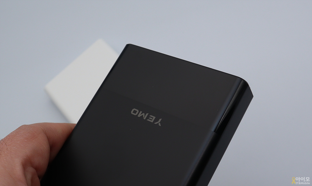 일반적인 직사각형 형태의 YEMO 충전기, 로고를 기준으로 충전 포트 쪽은 그로시한 재질로 투톤 디자인을 가지고 있구요.