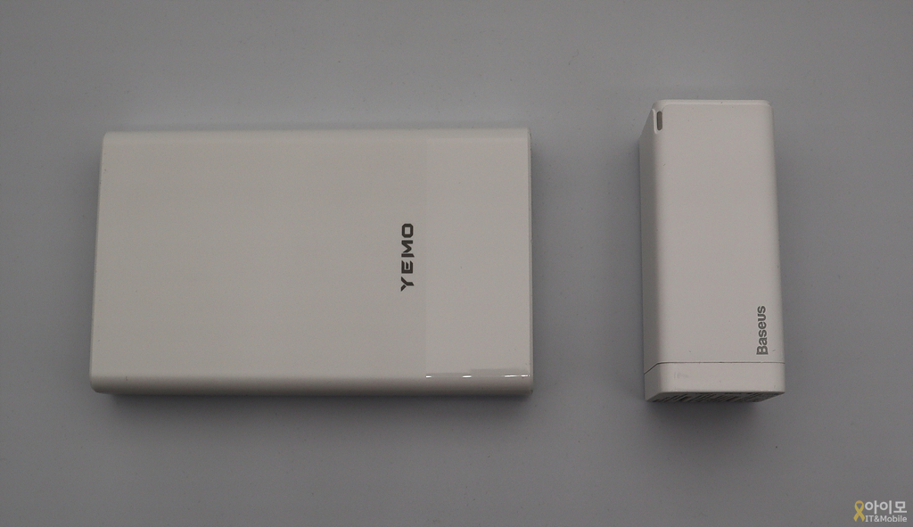 그래서 같은 출력을 가진 Baseus의 충전기와 비교해보면 그 크기가 무척 크다는 걸 알 수 있는데요. 얼핏 봐도 부피로는 2배 정도가 되지 않을까 생각이 됩니다.