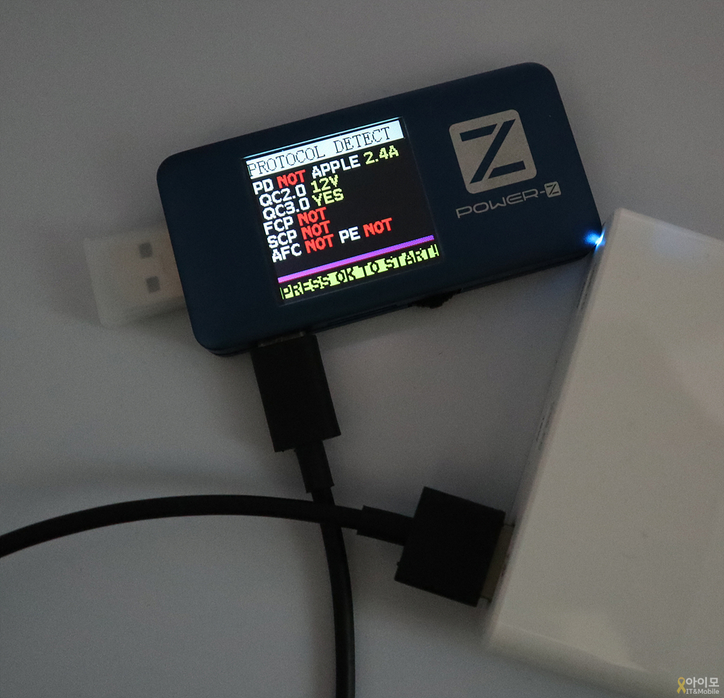 테스터를 연결해보니 각 포트에 기재된 데로 출력이 나오는 건 확인을 할 수 있었구요. 전원을 연결하면 충전 포트 좌측으로 LED가 들어와서 동작 상태임을 알려주고 있습니다.