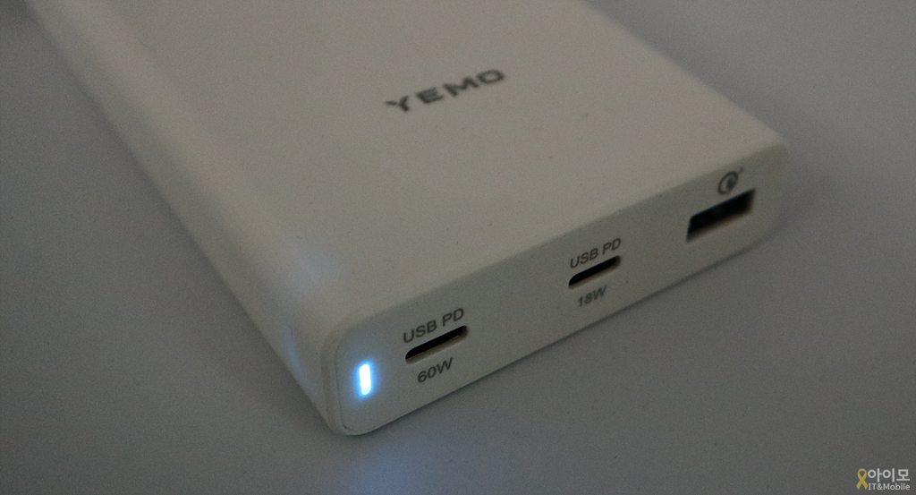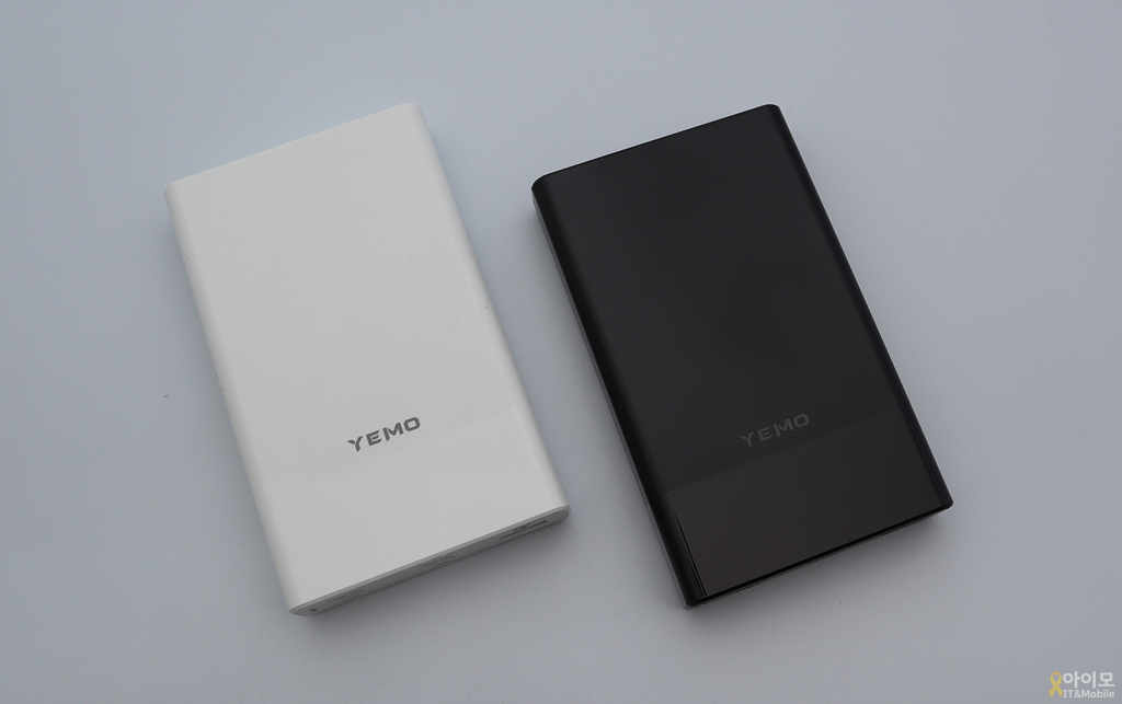 일반적인 직사각형 형태의 YEMO 충전기, 로고를 기준으로 충전 포트 쪽은 그로시한 재질로 투톤 디자인을 가지고 있구요.