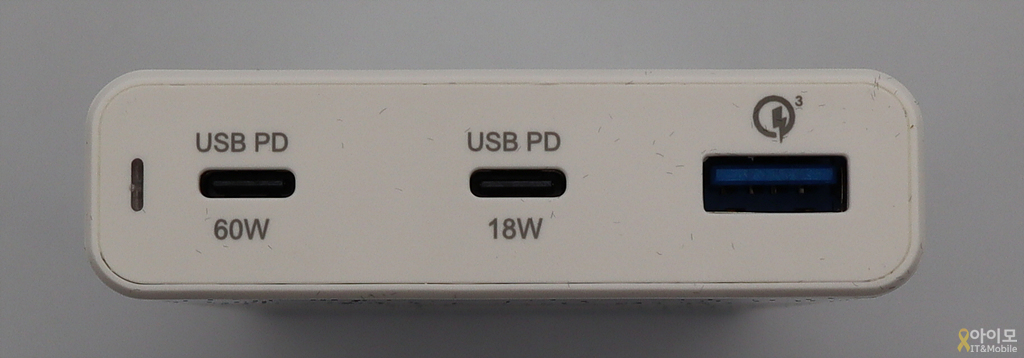 PD 호환 최대 60W를 지원하는 USB-C 포트 하나와 18W를 지원하는 USB-C 포트 하나, 그리고 퀄컴 퀵차지 3.0을 지원하는 USB-A 포트 하나로 구성이 되어있습니다.