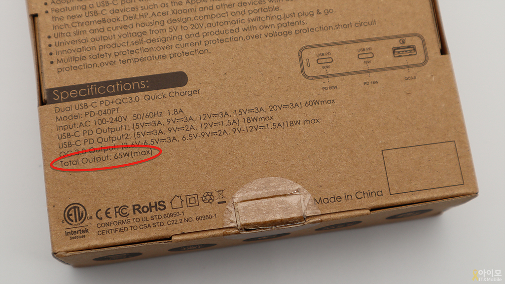 박스에는 최대 65W가 지원이 가능하다고 하고, 리뷰 중에서도 최대 65W까지만 지원을 한다고 별점 하나가 남았으니 최대 출력은 65W가 맞을 겁니다.