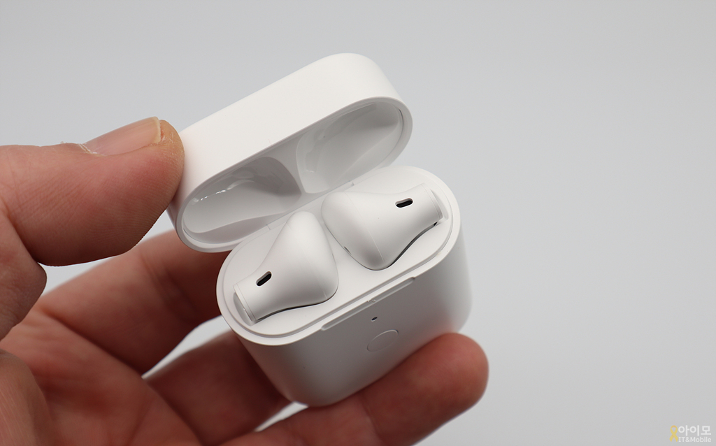 오픈형인 QCT T7의 이어버드(오른쪽)은 에어팟보다는 조금 더 길쭉한 느낌이구요. 에어팟과 마찬가지로 측면이 터치 버튼으로 에어팟과 비슷한 방법으로 조작이 가능합니다.