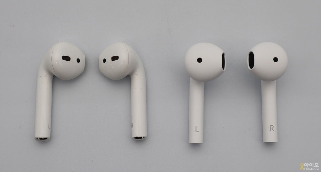 오픈형인 QCT T7의 이어버드(오른쪽)은 에어팟보다는 조금 더 길쭉한 느낌이구요. 에어팟과 마찬가지로 측면이 터치 버튼으로 에어팟과 비슷한 방법으로 조작이 가능합니다.