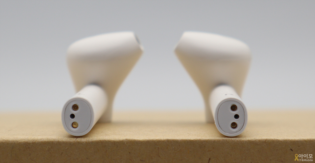이어버드에도 아래쪽에 충전을 위한 포고핀 2개와 마이크가 위치하고 있습니다.