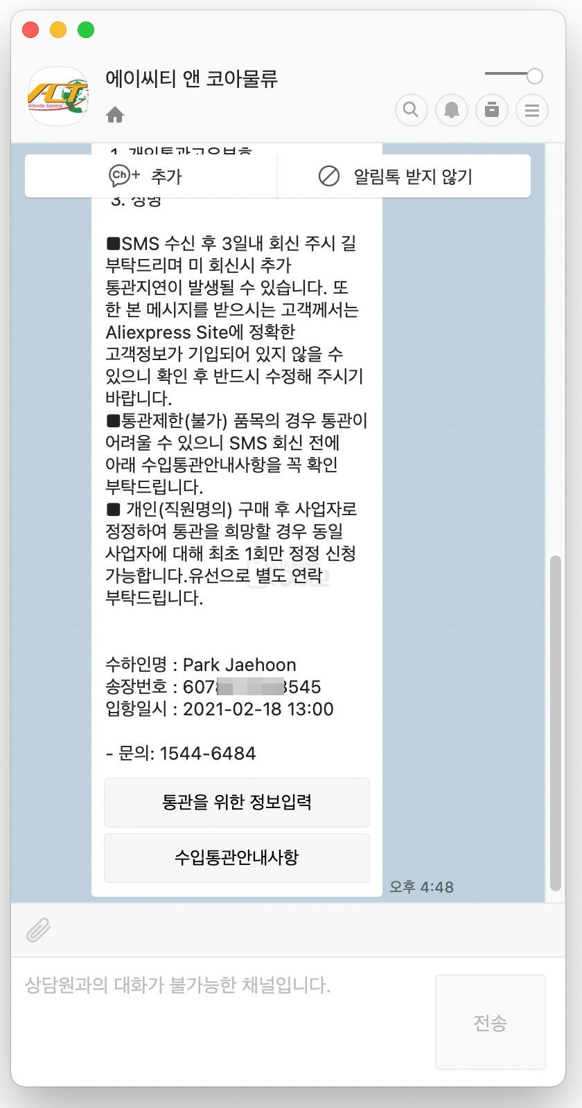 뜬금없이(처음이 아닌가 싶은) 통관 고유부호 입력이 안 되었다고 입력을 해달라는 안내였습니다.