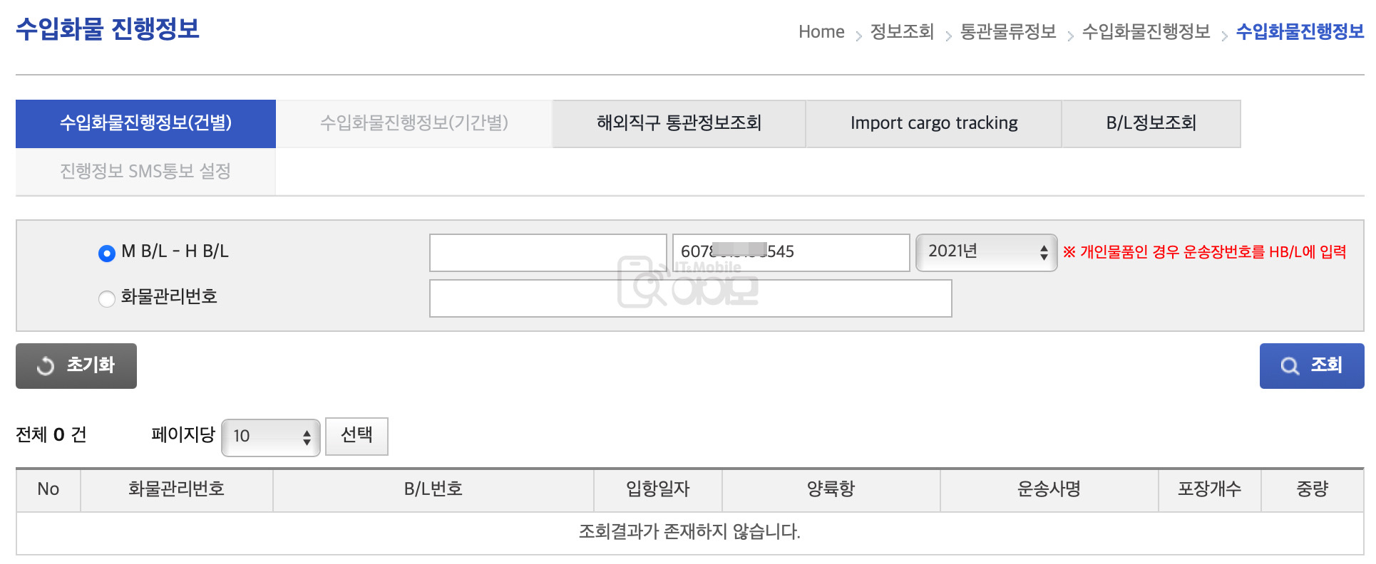 그런데 관세청 포털에서 조회해보니 아직 저 송장으로는 도착한 제품이 없다고.... 어쩌면 컨테이너로 들어온 상태에서 통관 고유 부호가 없으니 신고 전에 에이시티 앤 코아물류에서 카톡을 날려준게 아닌가 싶네요!