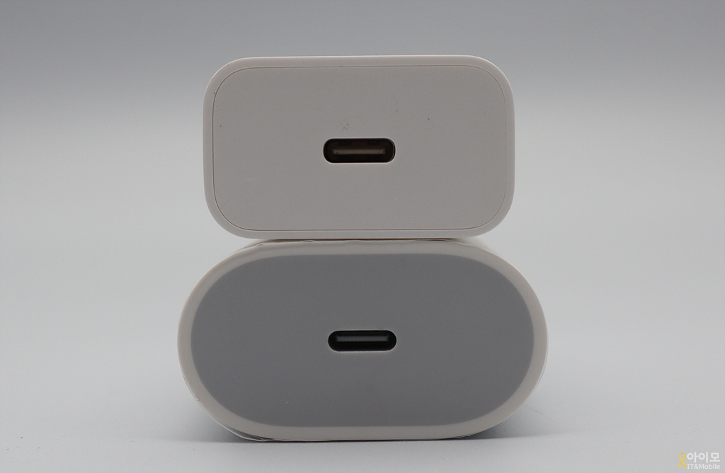 애플 어댑터가 조금 길어 보이지만 220V 플러그 때문으로 보이구요. 비슷한 두께에 라운드 디자인을 가진 애플 어댑터가 폭은 조금 더 넓습니다.