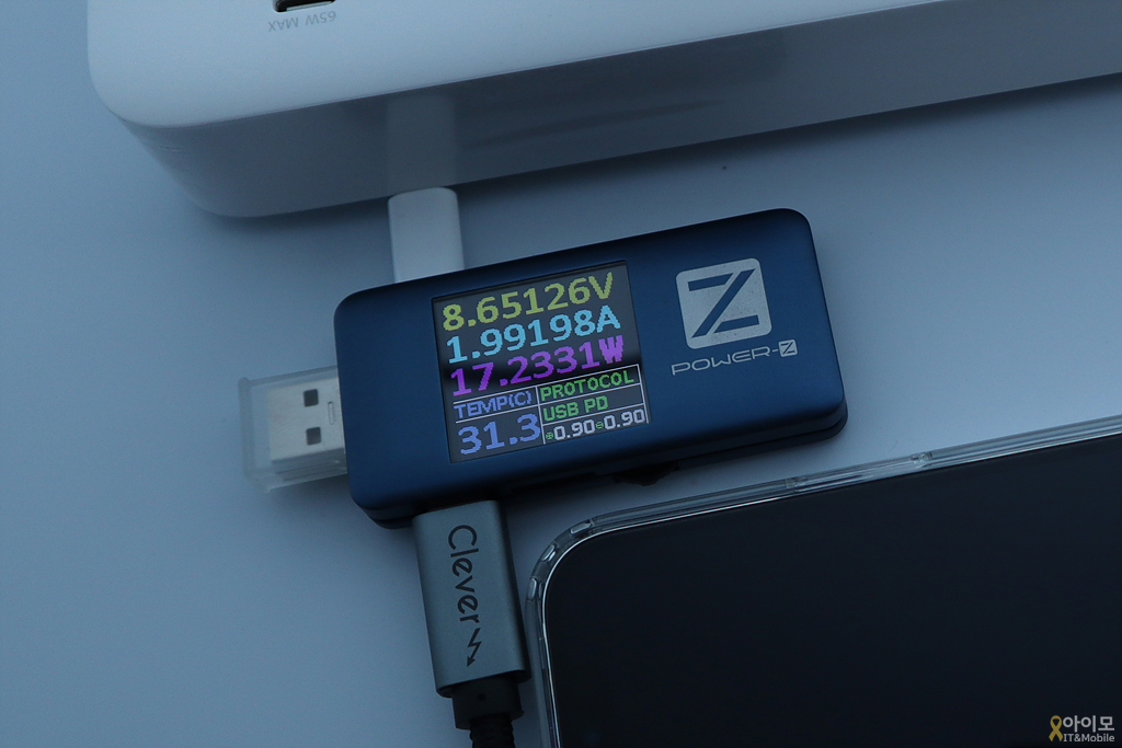 배터리 잔량 10% 수준의 아이폰 12를 연결해보니 약 17.2W로 기존 18W 어댑터와 크게 다르지 않았지만, 화면이 켜지게 되면 18.7W 정도까지 전원 공급이 늘어나는 걸 볼 수 있었습니다.