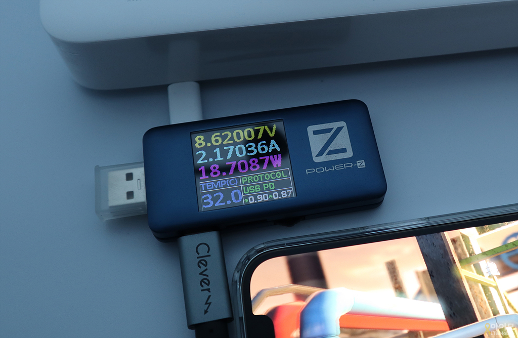 배터리 잔량 10% 수준의 아이폰 12를 연결해보니 약 17.2W로 기존 18W 어댑터와 크게 다르지 않았지만, 화면이 켜지게 되면 18.7W 정도까지 전원 공급이 늘어나는 걸 볼 수 있었습니다.